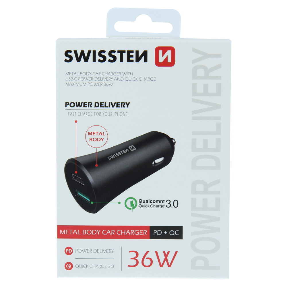 Swissten 2.4A Power Delivery (36W) Car Charger – 20111660 – With USB-A & USB-C Port – Black