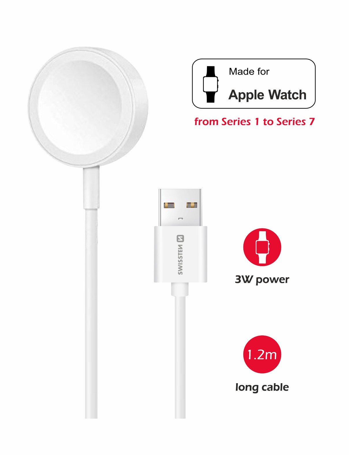 Swissten Apple Watch Wireless Charging Cable – 22055511 – With USB-A Cable – White