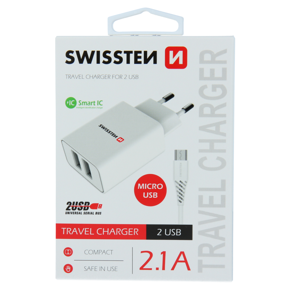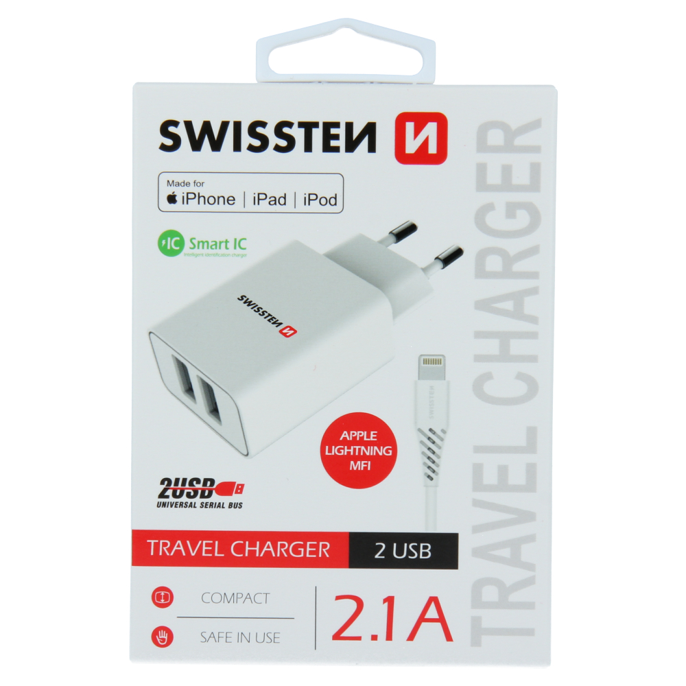 Swissten 2.1A Dual Port Travel Charger (10.5W) – 22055000 + MFI Lightning USB Cable – White