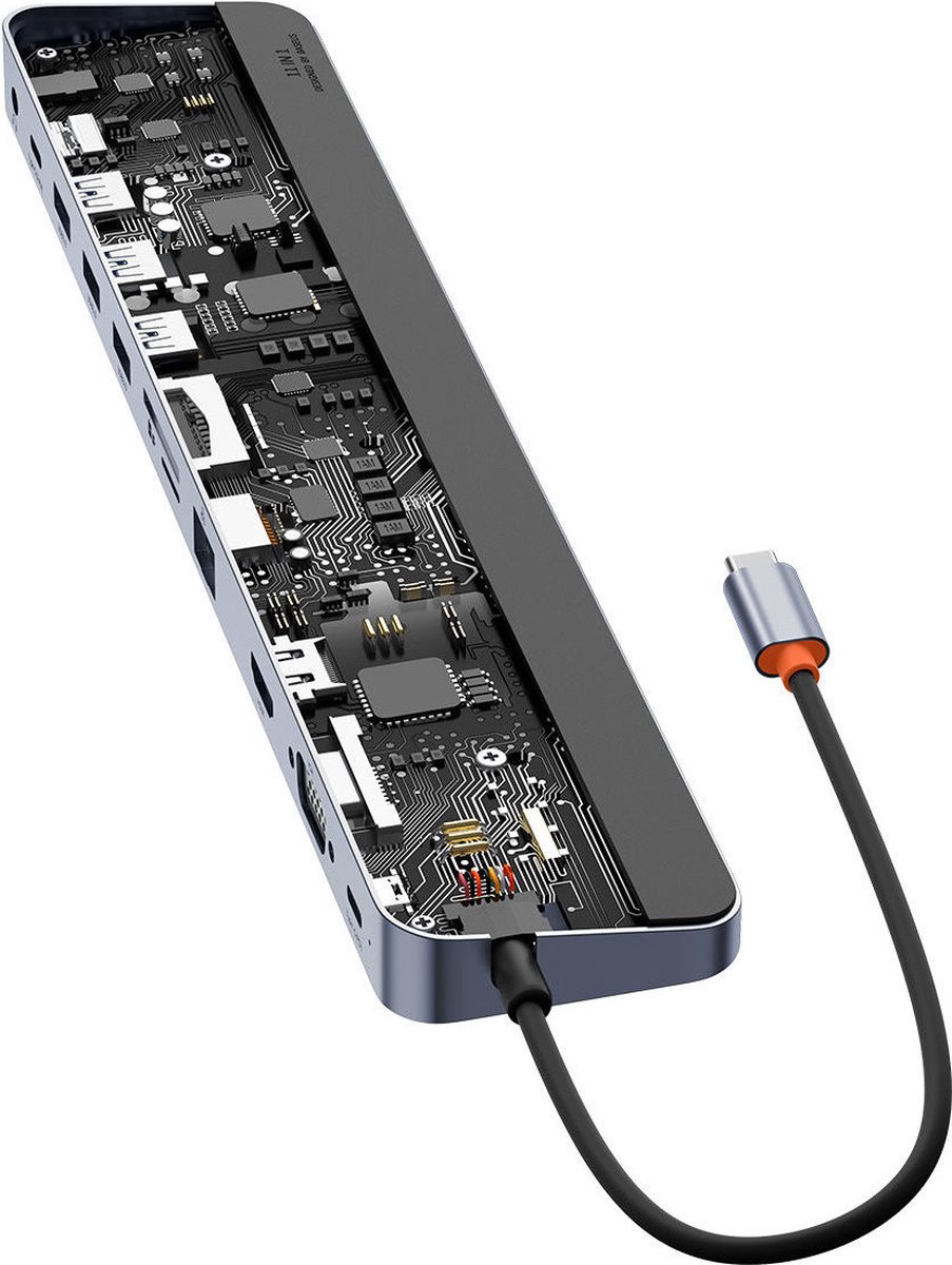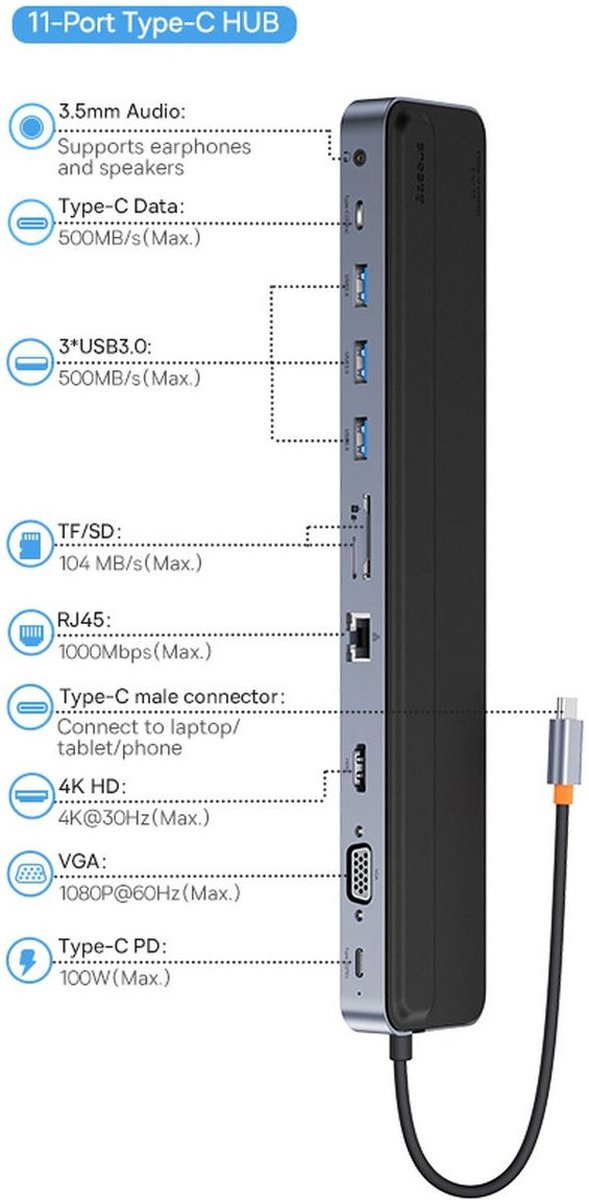 Functionaliteit: 11-in-1 adapter (Type-C naar HDMI, 3x USB3.0, Type-C PD, DisplayPort, VGA, SD/TF, RJ45, Type-C data, Jack 3.5mm)