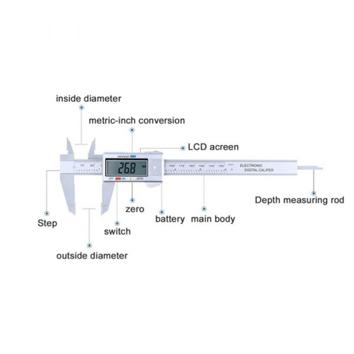 Electronic Digital Caliper offers instant and accurate readings of inside, outside, step, and depth measurements with accuracy of 0.01 “. SAE / Metric conversion switch automatically converts measurements to inches or millimeters with the simple press of a button. Adjustable thumbscrew provides tension for optimal movement of the slide and locks the jaws of the caliper in place.