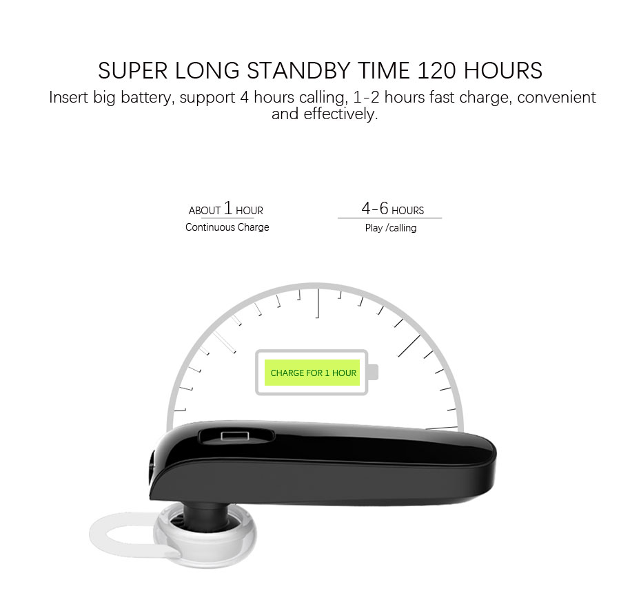 Bluetooth version: V4.1 + EDR – Standby: 120hr – Talking time: 4hr – Battery: 70mAh – Charging time: 1-2hrs.