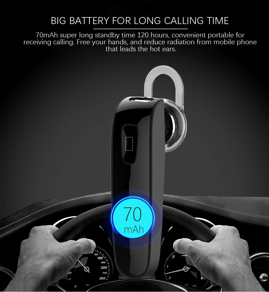 Bluetooth version: V4.1 + EDR – Standby: 120hr – Talking time: 4hr – Battery: 70mAh – Charging time: 1-2hrs.