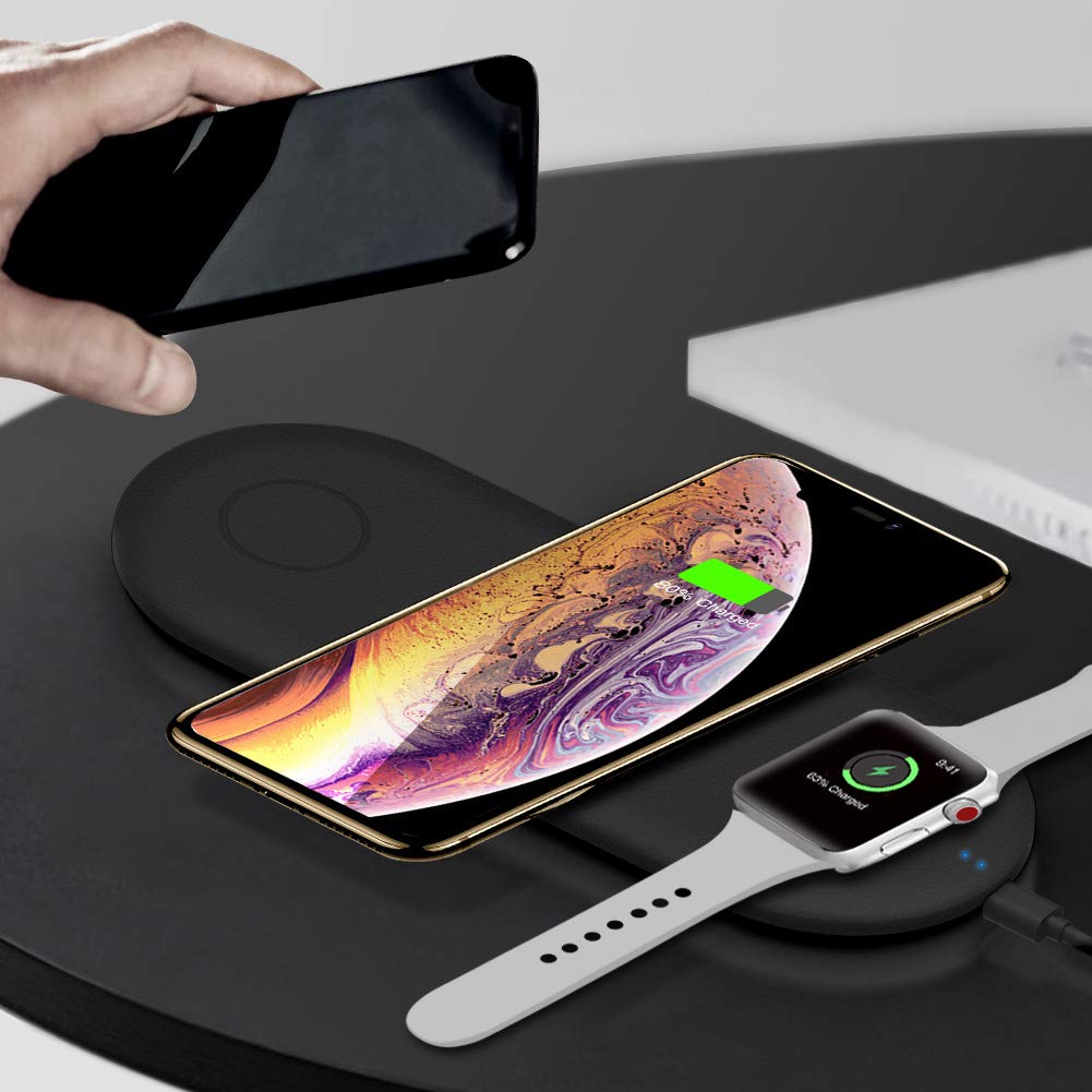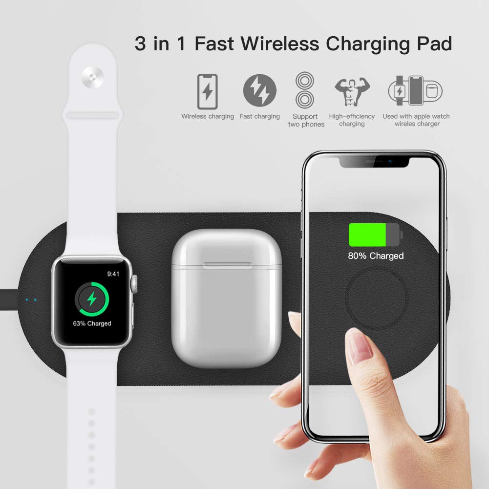 Simultaneously charge your iPhone & Apple Watch & Airpods (with the wireless charging case) or Apple Watch & 2 Smartphones, connected with QC2.0 or above power adapter. Advanced Qi-enabled technology delivering up to 7.5W for iPhones and 10W for Samsung smartphones. Premium leather design, type-C interface and highly efficient chipset ensures a reliable, high-speed wireless charging. Specifications: