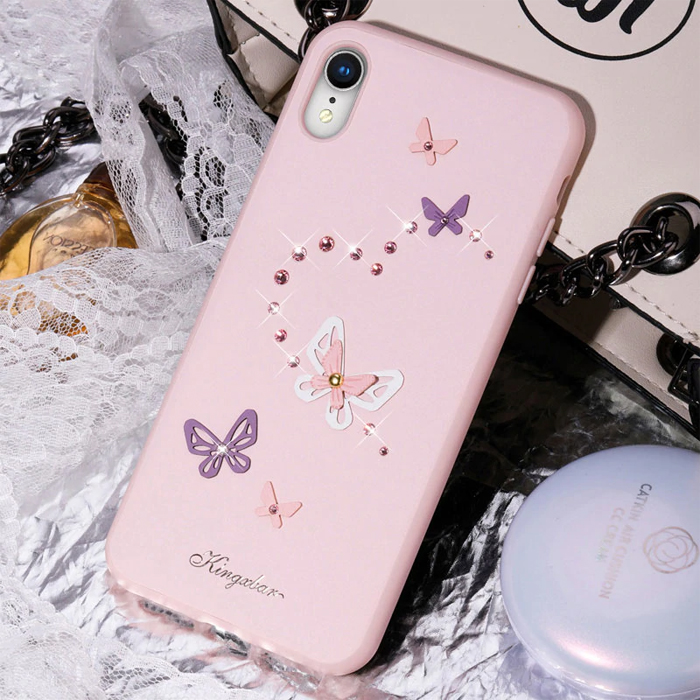Kingxbar Apple iPhone XR – 3D Crystals PU Leather Case – Butterfly Pink