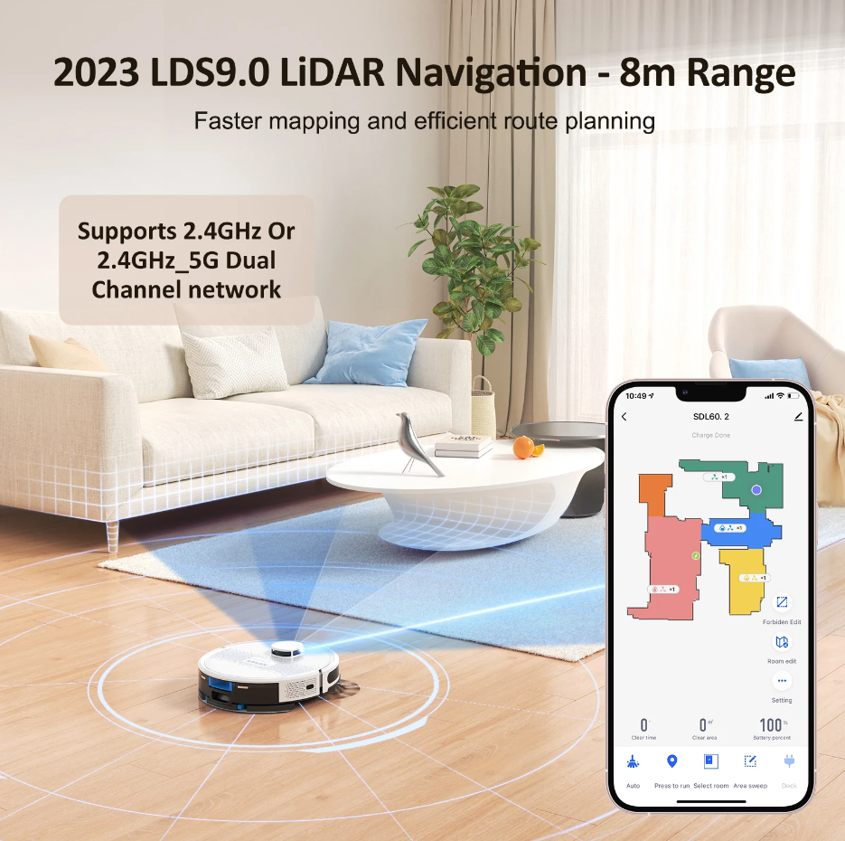 Zeg vaarwel tegen willekeurige schoonmaakpatronen en hallo tegen systematisch schoonmaken met de Laser Distance Sensor (LDS) 9.0 Lidar cartografie en SLAM-navigatie van de SL60D. Deze innovatieve technologie stelt de robotstofzuiger in staat om tot wel 5 nauwkeurige kaarten van je huis te maken, waardoor grondige dekking gegarandeerd is met 3x betere nauwkeurigheid dan gewone LDS. Met een laserbereik van 8 meter kan hij door complexe omgevingen navigeren en optimale schoonmaakroutes plannen, zodat geen hoekje onaangeroerd blijft.