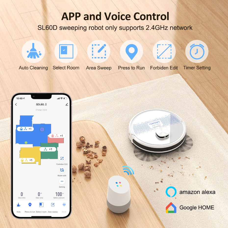 Neem controle over je schoonmaakschema met de Smart Life-app en spraakopdrachten. Of je nu thuis bent of onderweg, je kunt het schoonmaakproces eenvoudig volgen en aanpassen. Gebruik gewoon de app of spraakopdrachten met Alexa of Google Assistent om het schoonmaken te starten of stoppen op basis van je aangepaste kaart. Bovendien is de ondersteuning voor zowel 2.4 GHz als 2.4GHz_5G Dual Channel Network, connectiviteit is nooit een probleem.