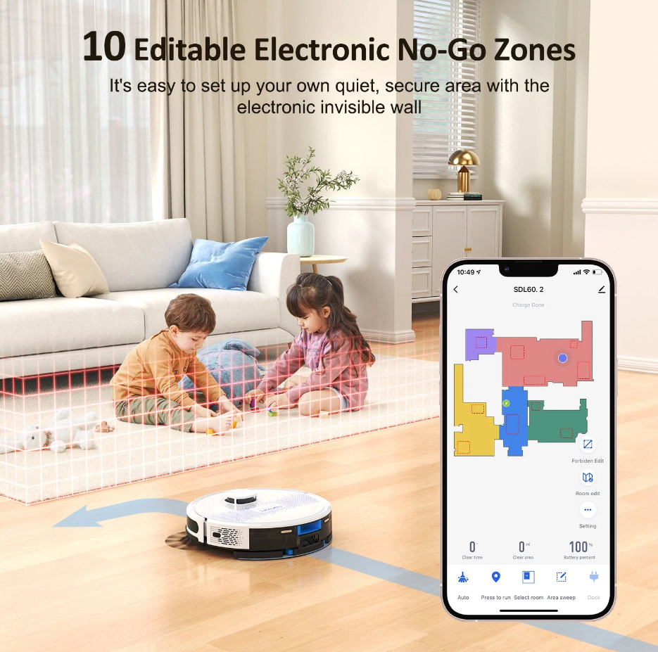 Van vegen en stofzuigen tot dweilen, de SL60D kan het allemaal. Met zijn 3-in-1 functionaliteit kun je eenvoudig schakelen tussen modi om verschillende schoonmaaktaken aan te pakken. Plus, met aanpasbare reinigingsmodi en no-go zones, heb je volledige controle over hoe en waar de robot schoonmaakt.