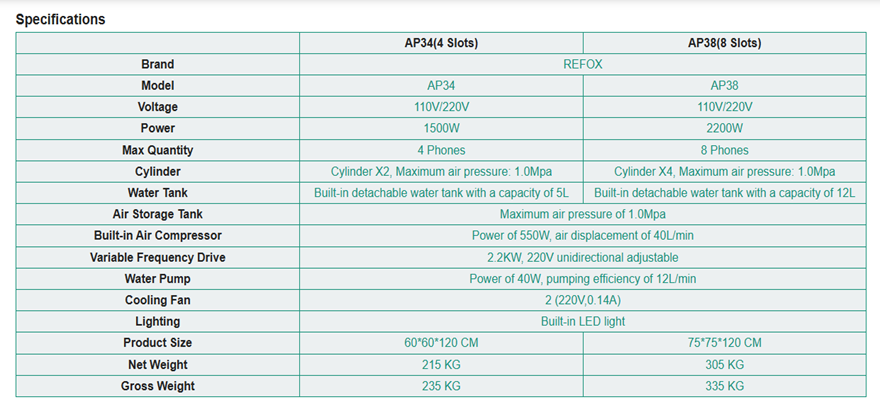 REFOX AP34/38 is a professional mobile phone screen polishing machine designed to remove surface scratches and smooth finishes using the advanced watermill method. It supports a wide range of screen polishing options for various device models, making it an ideal solution for refurbishment factories and recycling companies seeking to improve refurbishment efficiency and reduce costs.