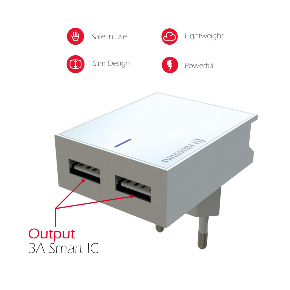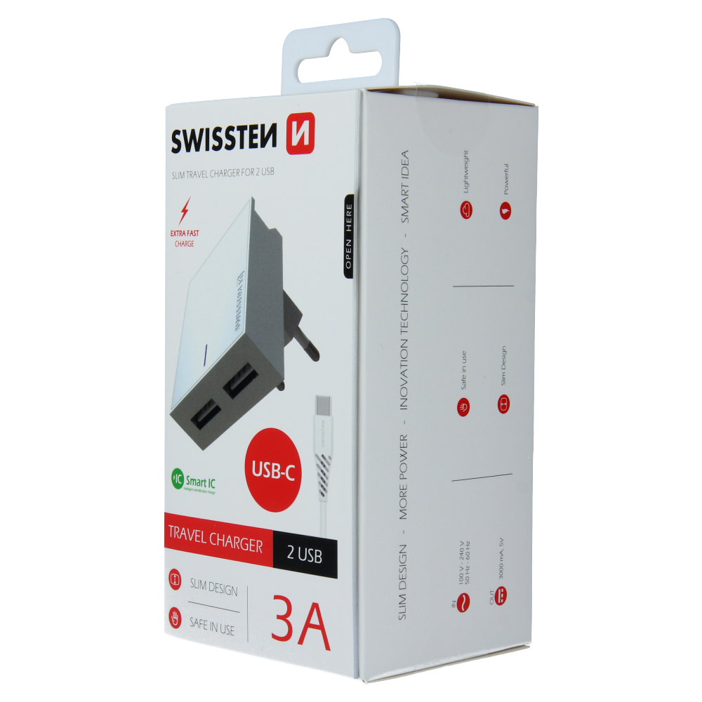 The ultra-thin Swissten SMART IC network adapter has 2 USB ports and a total output current of 3A. So you can easily charge two devices at once. Thanks to SMART IC moreover optimally distributes the output current from each device charging. You can use the charger as a mobile phone stand while charging. Package contains 1.2m USB / USB-C data cable. Color white. Packed in Swissten retail pack.
