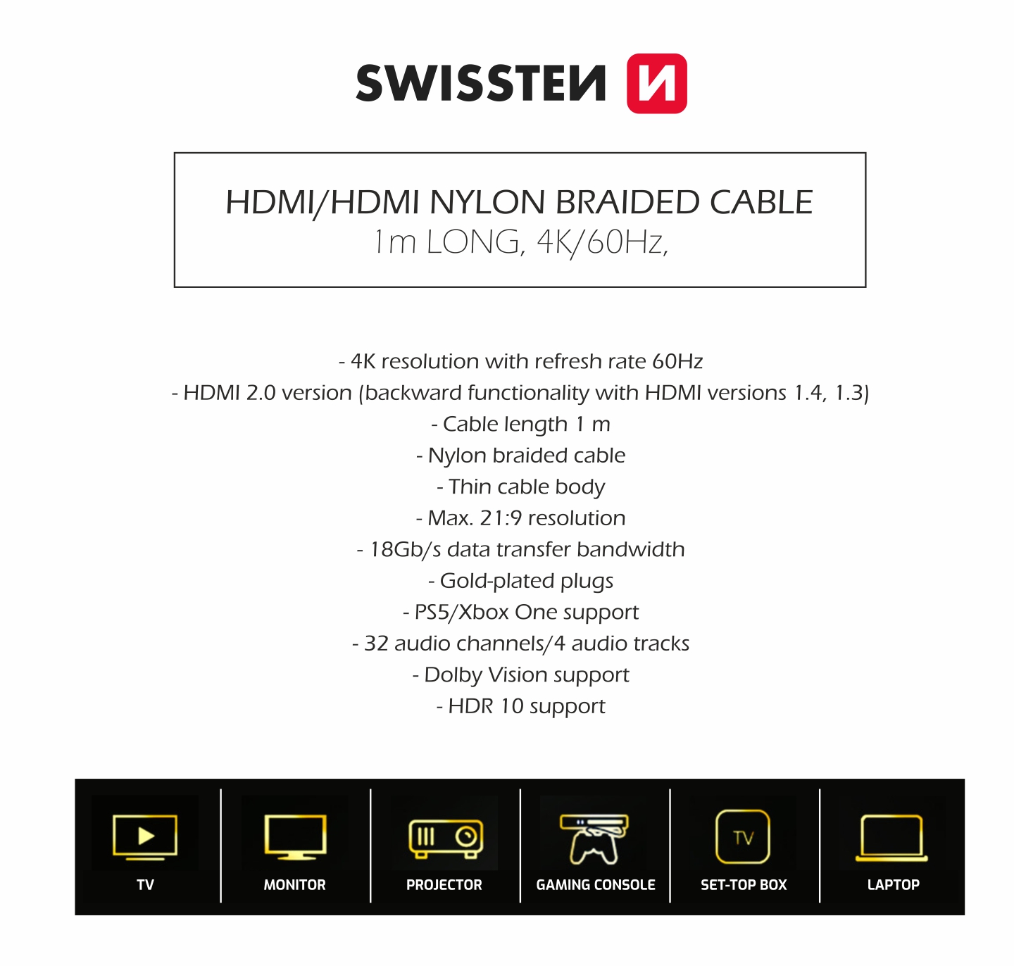 Are you looking for a quality braided HDMI cable that will transmit the image with the sound of your device and in 4K quality with a refresh rate of 60Hz? You found it right! Swissten is a great variant of the HDMI interface for image and sound transmission using an HDMI 2.0 cable and, at the same time, 4 audio tracks and 32 sound channels. Thanks to several smart functions that the cable has, it fulfills the requirements of practically every customer. These include VRR, HDR, QMS, and more.