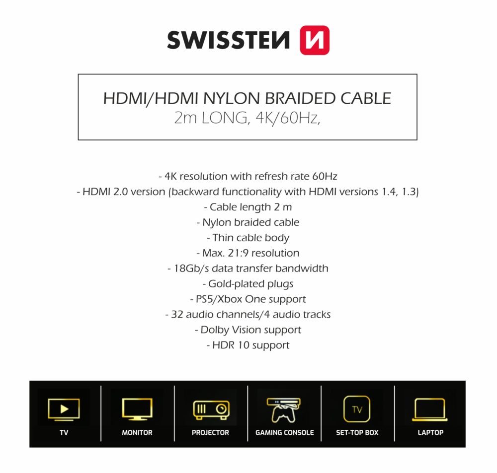 Are you looking for a quality braided HDMI cable that will transmit the image with the sound of your device and in 4K quality with a refresh rate of 60Hz? You found it right! Swissten is a great variant of the HDMI interface for image and sound transmission using an HDMI 2.0 cable and, at the same time, 4 audio tracks and 32 sound channels. Thanks to several smart functions that the cable has, it fulfills the requirements of practically every customer. These include VRR, HDR, QMS, and more.