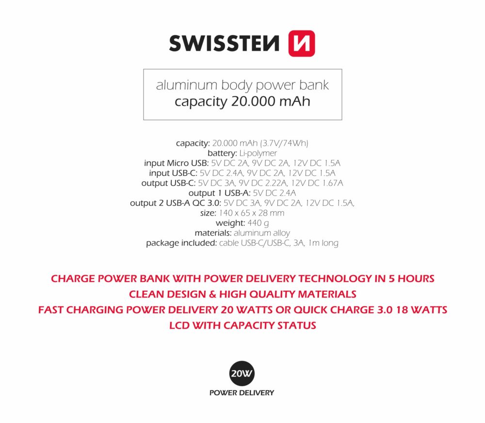 SWISSTEN aluminium powerbank with 20.000mAh capacity, microUSB and USB-C inputs, 2xUSB-A, 1xUSB-C outputs and PD and QC fast charging. Packed in SWISSTEN retail pack.