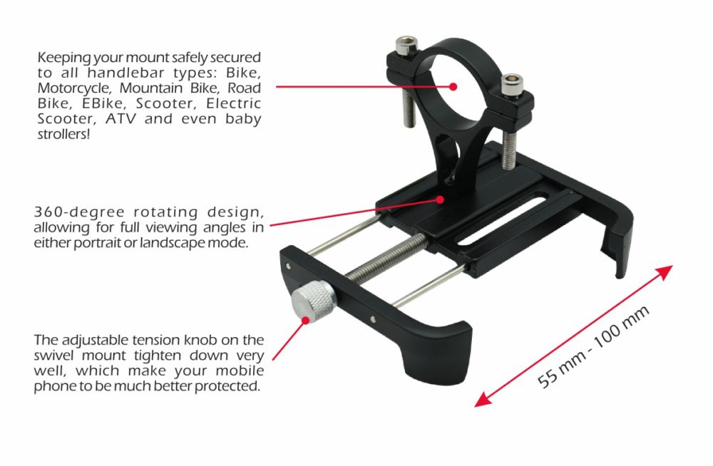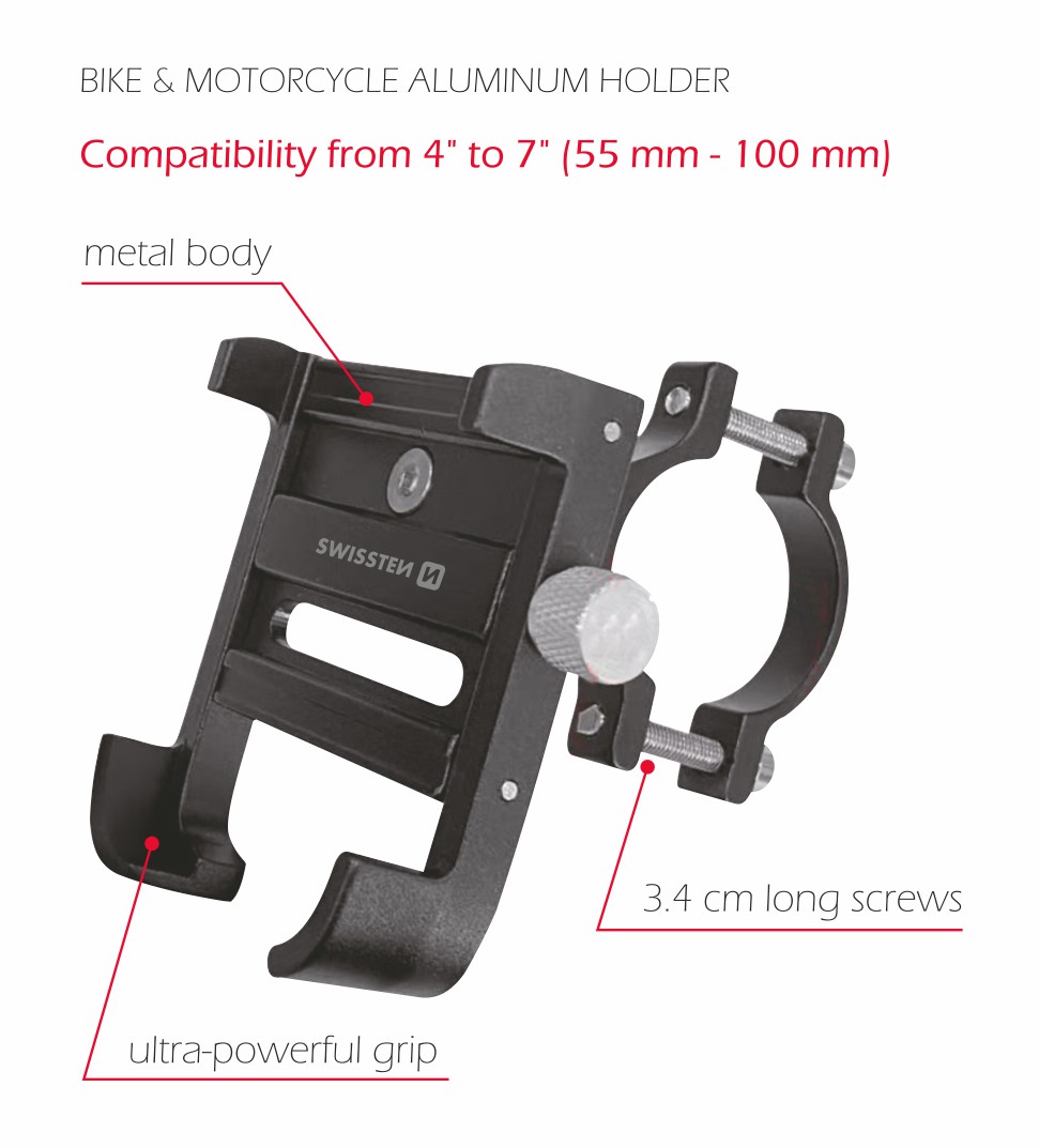 Metal smartphone holder 4-7″, which can be used both on a bicycle and on a motorcycle, quad bike, electric bike, etc. Packed in a SWISSTEN blister. 8595217478183