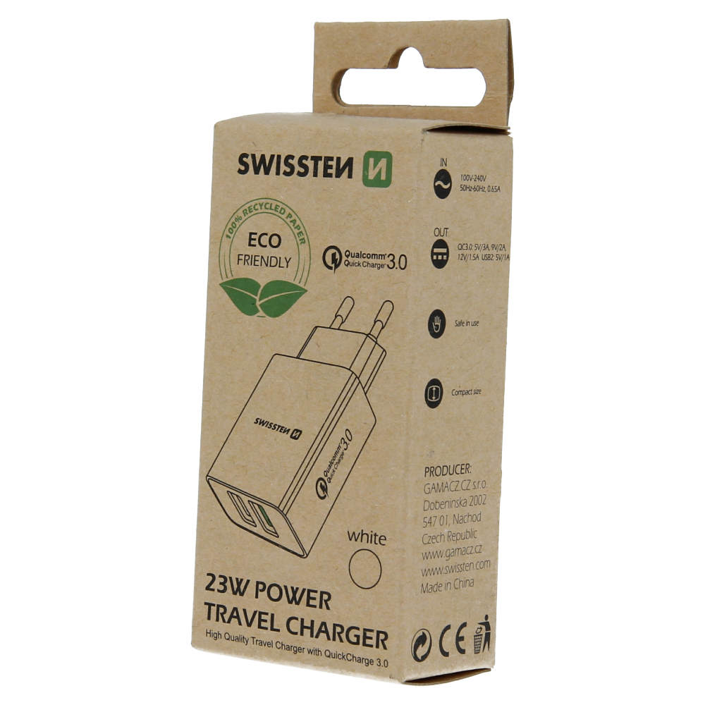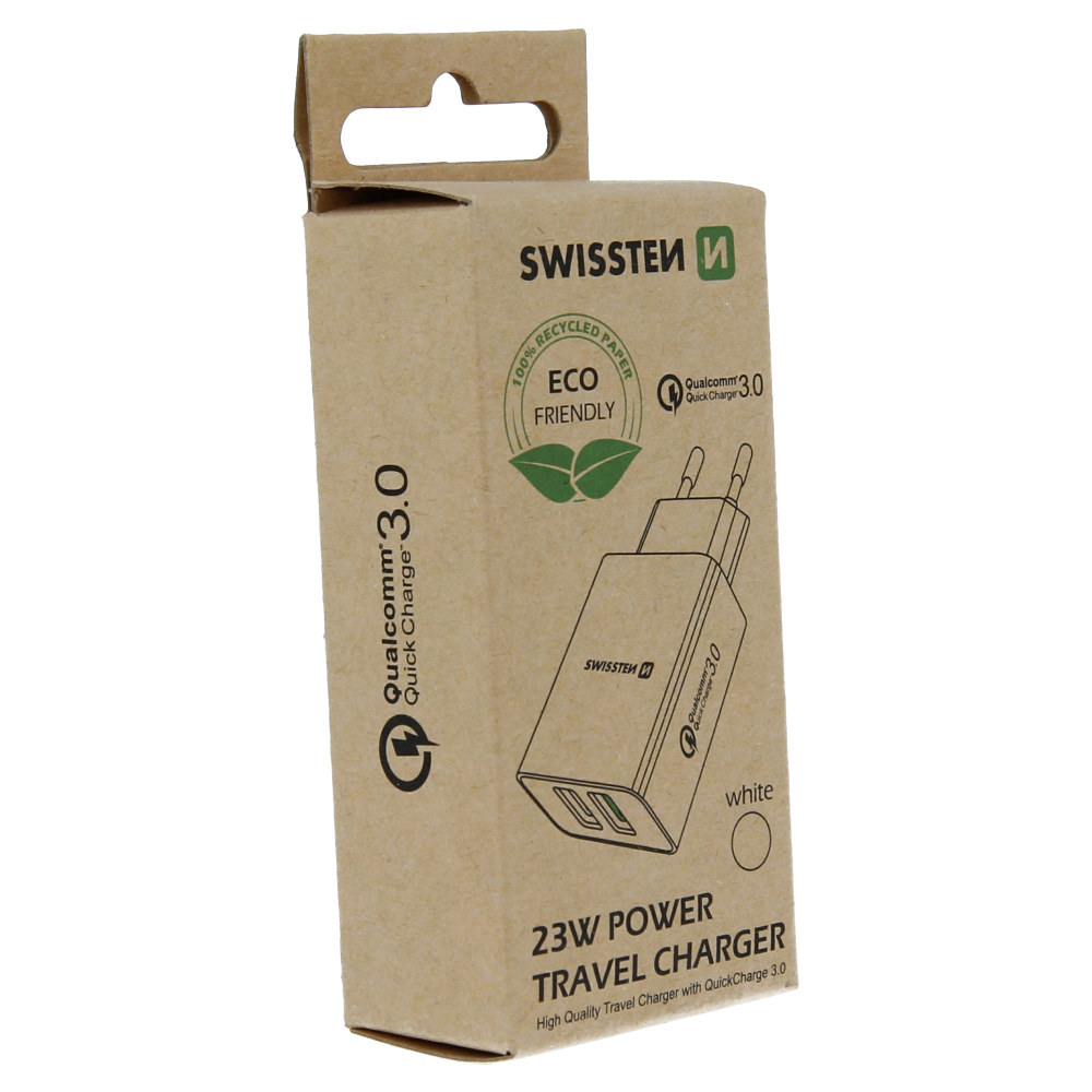 De Swissten oplader heeft twee USB-uitgangspoorten. De eerste poort maakt gebruik van Qualcomm 3.0-technologie, en de tweede heeft een uitgangsvermogen van 5W. Verpakt in Swissten retailverpakking.