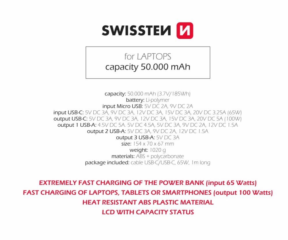 The elegant SWISSTEN power bank with a capacity of 50,000mAh (185Wh) has a high output power of 100W, fast charging and is made of non-flammable material for added safety. Packed in a SWISSTEN retail pack.