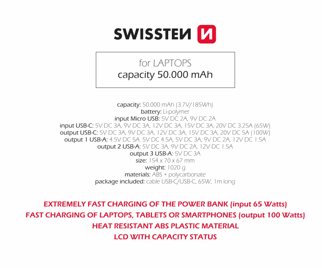 The elegant SWISSTEN power bank with a capacity of 50,000mAh (185Wh) has a high output power of 100W, fast charging and is made of non-flammable material for added safety. Packed in a SWISSTEN retail pack.