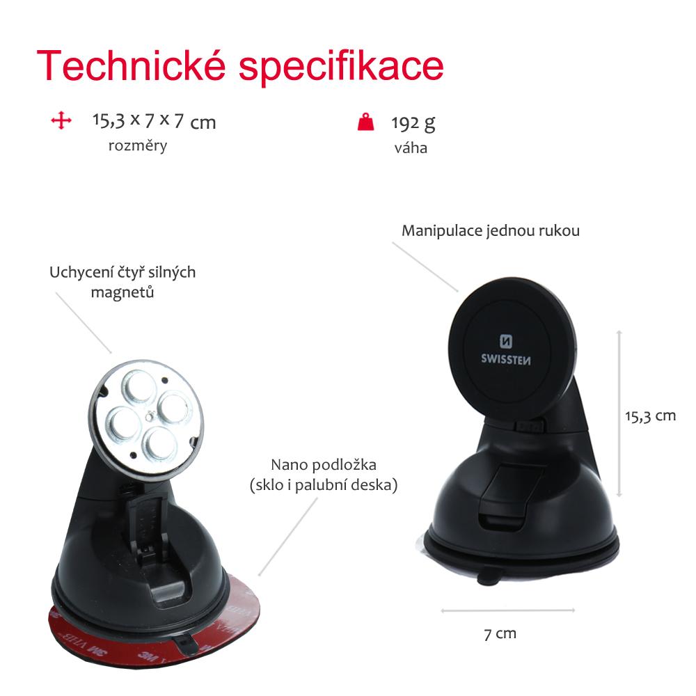 Magnetic holder Swissten S-GRIP M1 excels in its versatility. Just attach one of the metal sheets to your smartphone and you can start using it. For dashboard and windshield. Included is a 3M plate for better grip on thicker surfaces. Packed in Swissten blister.