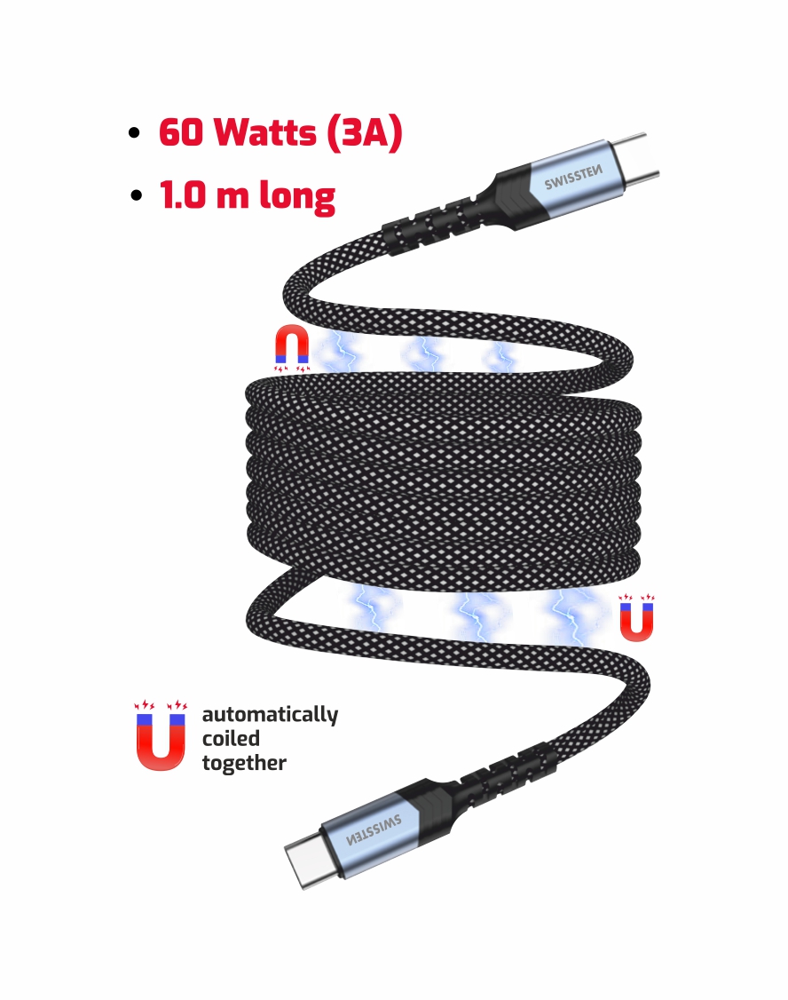Are you looking for a USB-C charging cable that takes up no space but is 1 meter long? You found it right! The Swissten magnetic self-winding cable with data transmission will fulfill all your wishes and save you a lot of space compared to tower cables.