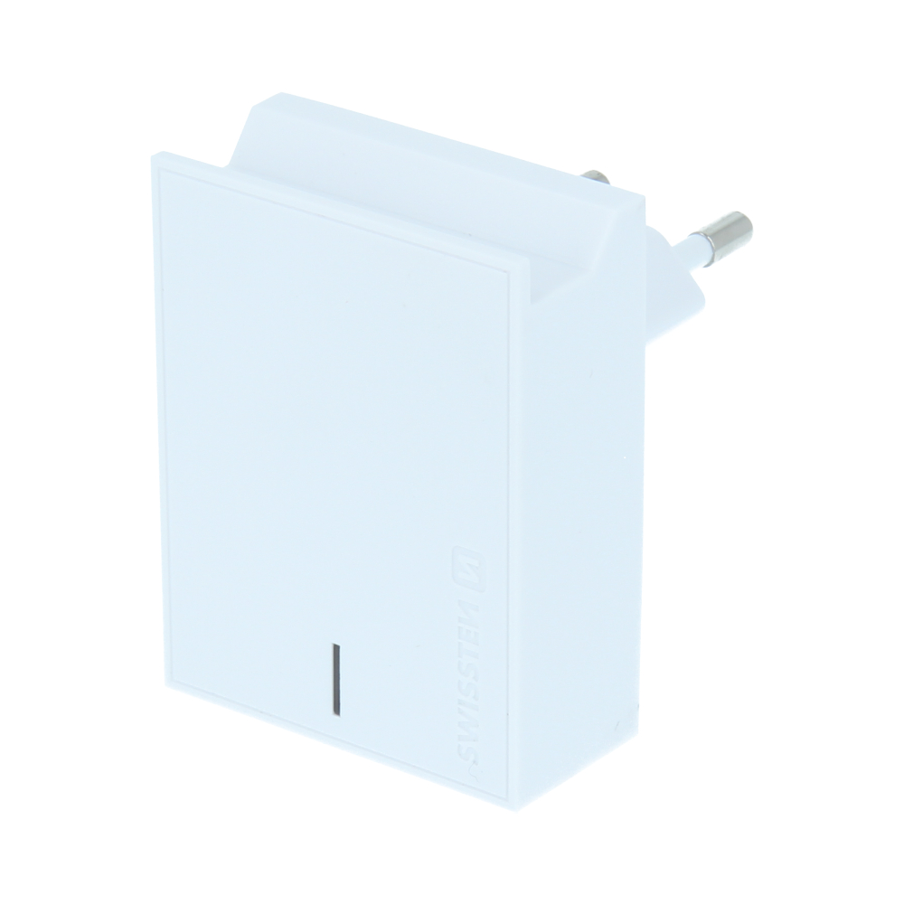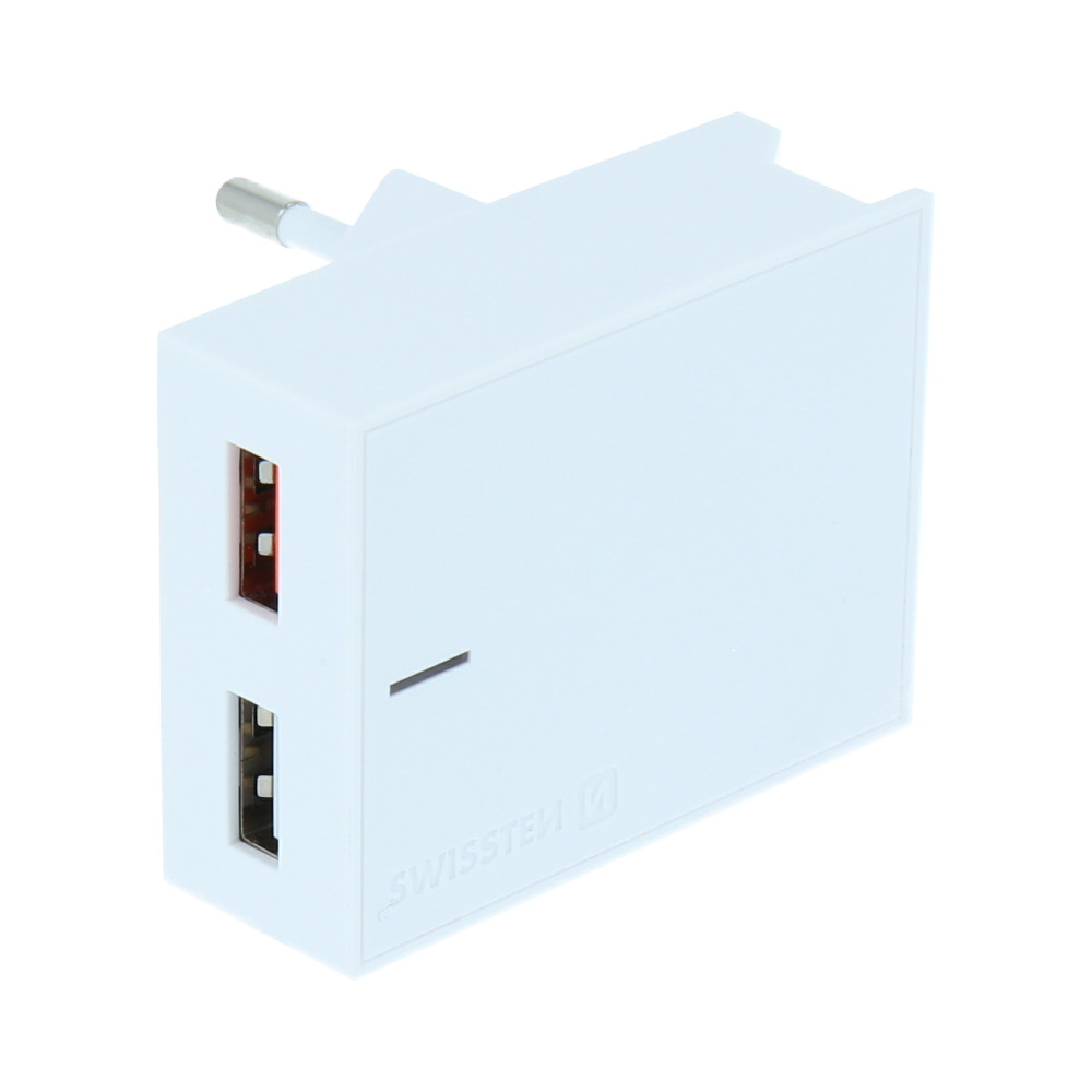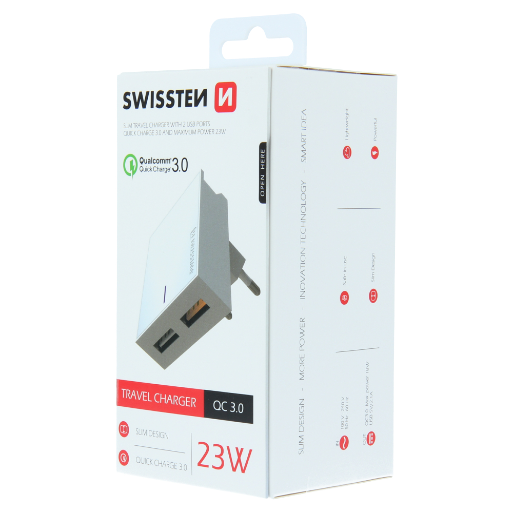 Unique SLIM charger with 23W power, Qualcomm technology, smartphone stand, two USBports. One USB is equipped with Qualcomm technology for fast Android smartphone charging. The second has an output current of 2.1A. Can be used behind furniture, in a free drawer or anywhere as a smartphone holder. Packed in SWISSTEN blister.