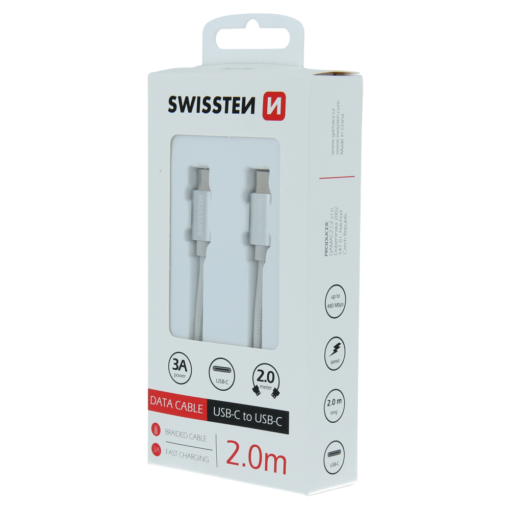 High quality textile data cable USB-C/USB-C with length of 2,0 m. The cable reinforced to deliver a higher current (up to 3A) and can handle fast 480 Mb/s data transfer. Packed in Swissten retail pack. 8595217476370