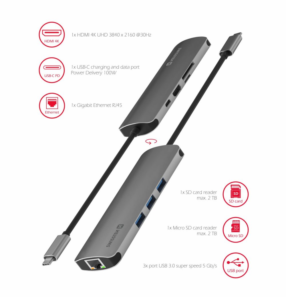 Swissten USB-C Hub 8 in 1 – 44040103 – (USB-C PD, HDMI 4K, LAN RJ45, 3x USB 3.0, SD, Micro SD) Aluminium