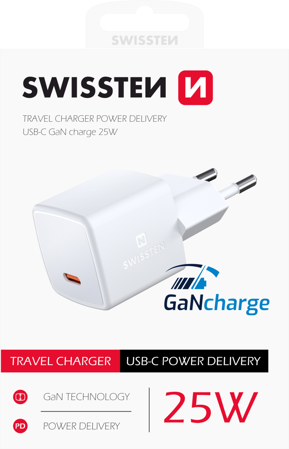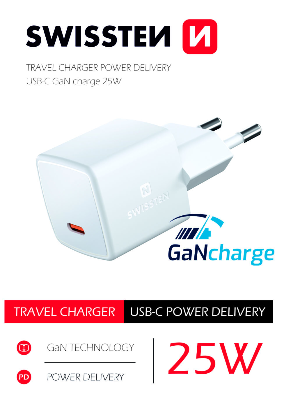 New range of SWISSTEN mini chargers with revolutionary GaN technology. The USB-C output port is equipped with Power Delivery fast charging technology with total power of 25W. Packed in SWISSTEN retail pack.