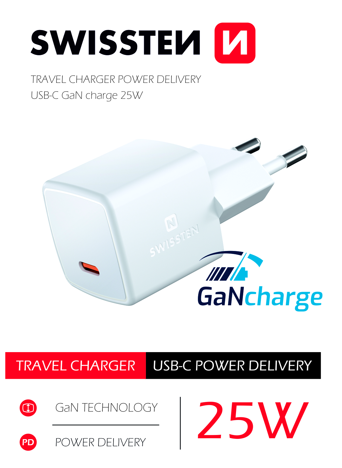 New range of SWISSTEN mini chargers with revolutionary GaN technology. The USB-C output port is equipped with Power Delivery fast charging technology with total power of 25W. Packed in SWISSTEN retail pack.