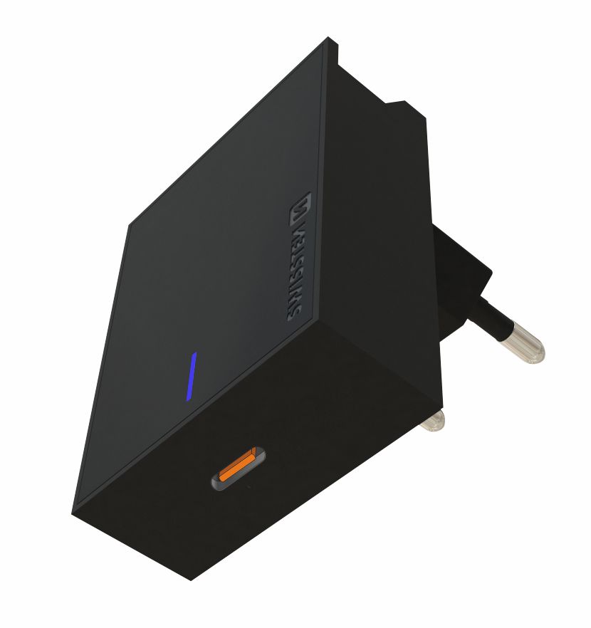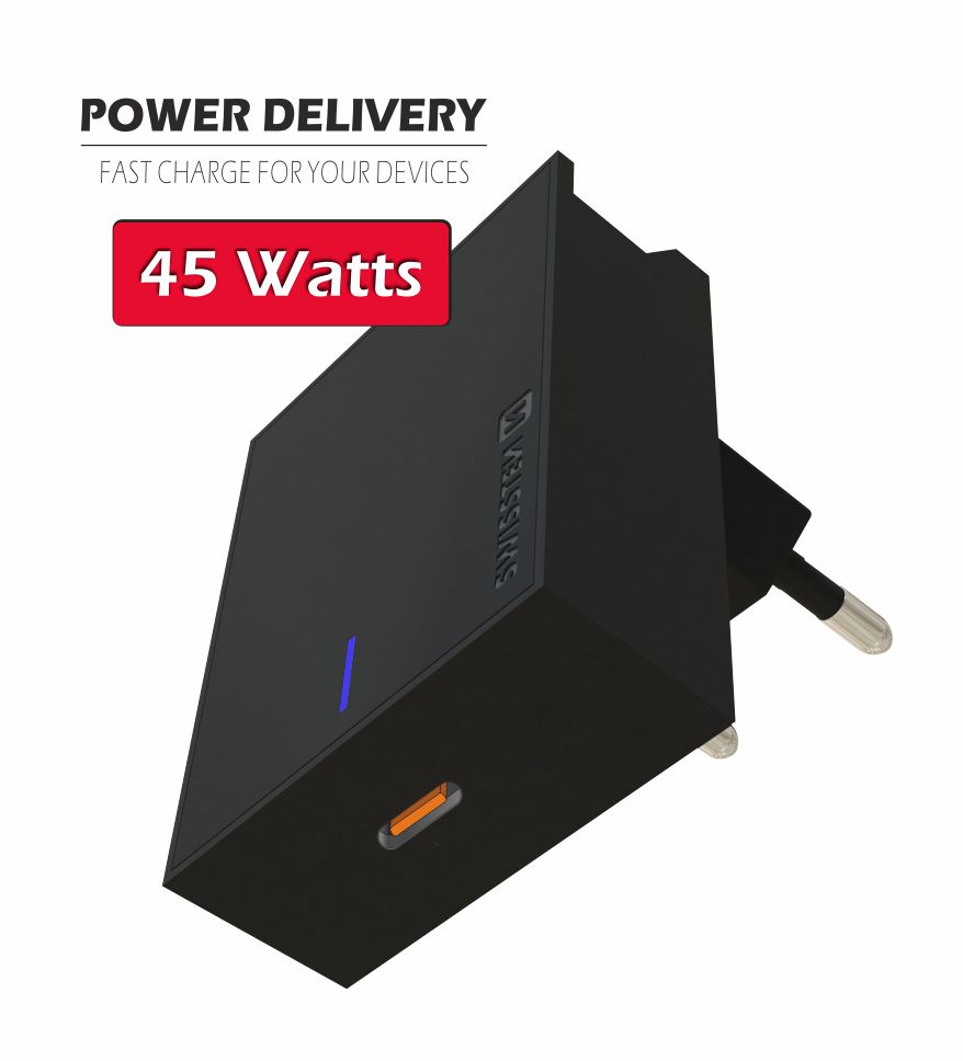 Unique SLIM travel charger with USB-C output, 45W power and POWER DELIVERY technology (for charging iPhone 8 and newer, iPads, Macbooks). You can use the smartphone stand on the top of the charger. Packed in SWISSTEN retail packing.