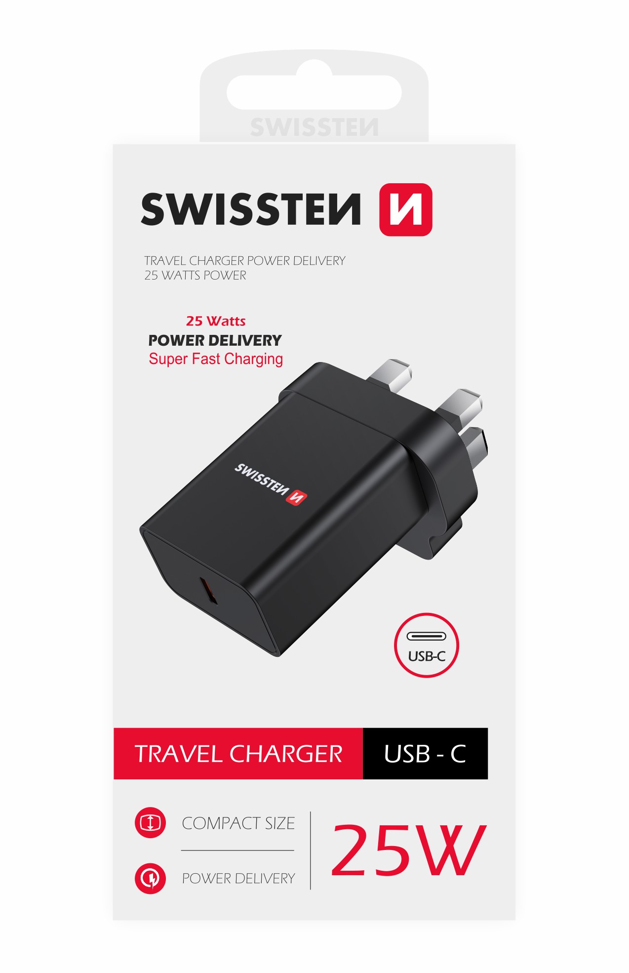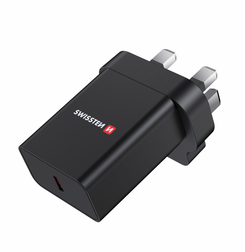 “The charger has a USB-C output port with Powerdelivery technology for both Apple and Super fast charging for Samsung, a fork for UK sockets and 25W output power. Packed in a SWISSTEN retail pack.