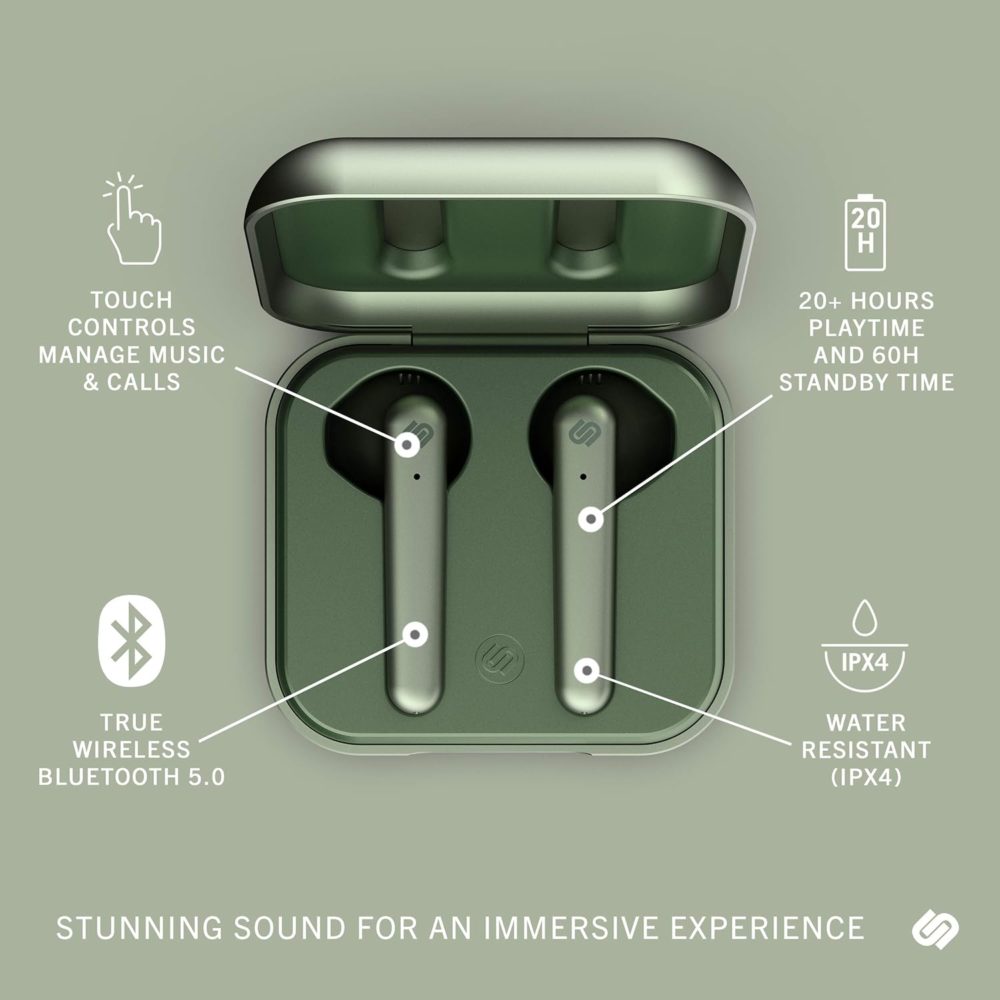 Maak kennis met de Urbanista Paris draadloze oortelefoons, verkrijgbaar in drie stijlvolle kleuren: zwart, groen en rosé goud.