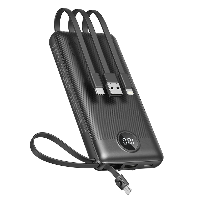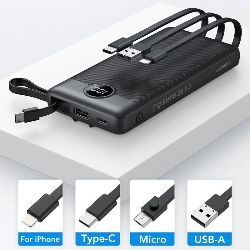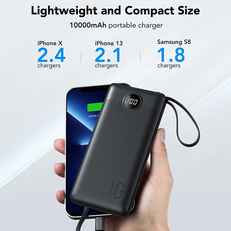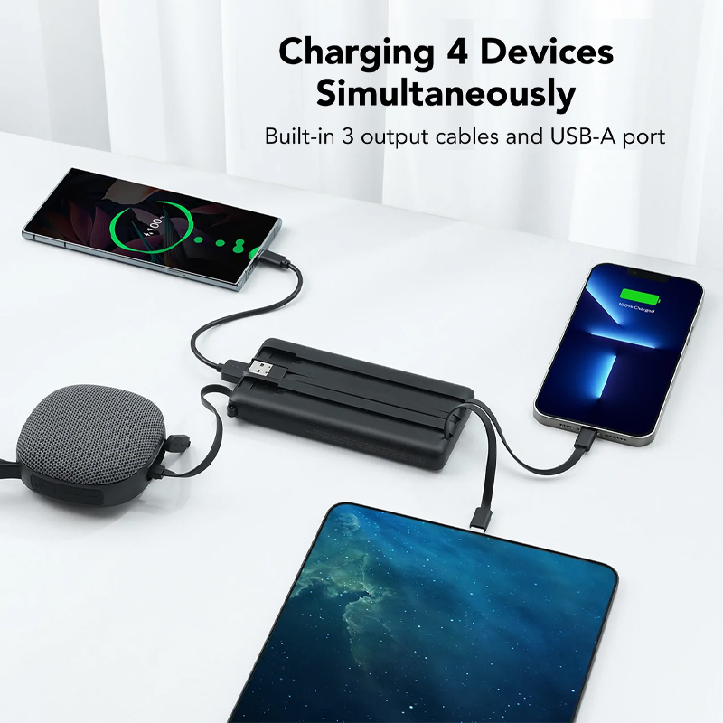 With USB-A and Type-C ports, and 4 built-in cables for charging most devices directly and recharging power bank itself.