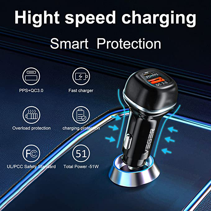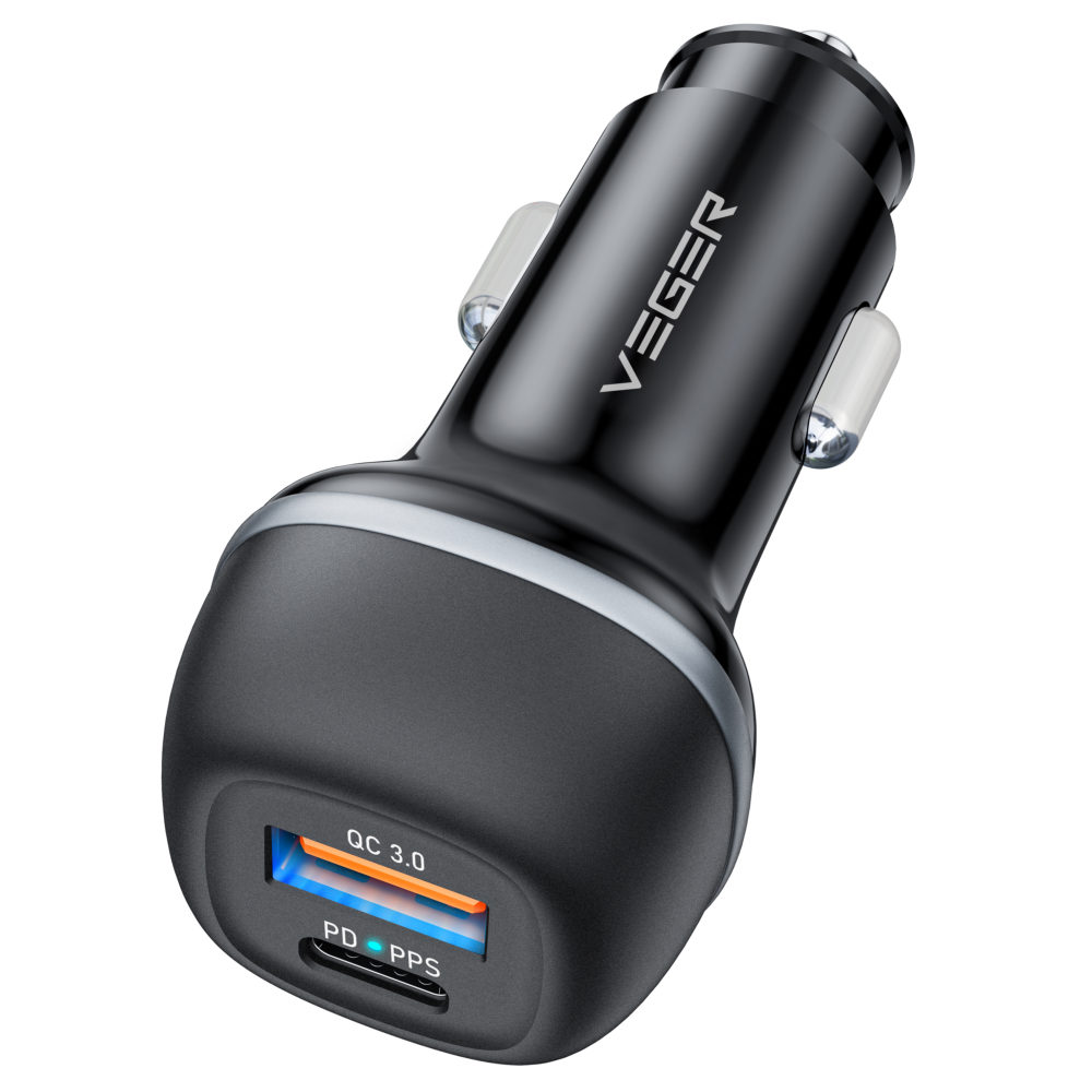 Veger Car Charger – Dual USB PD 51W Fast Charging – Black