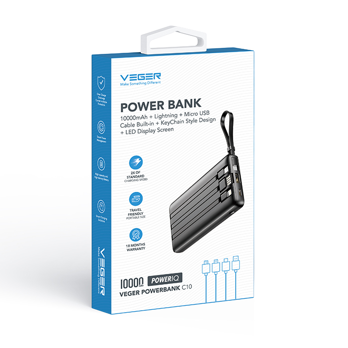 10000mAh high capacity in a compact body. Weights only 170g which is easy to slip into your purse or pocket. The extra durable lanyard is perfect for hanging on your backpack when camping, hiking, or exploring. You can charge 3 devices at once with this portable power bank.