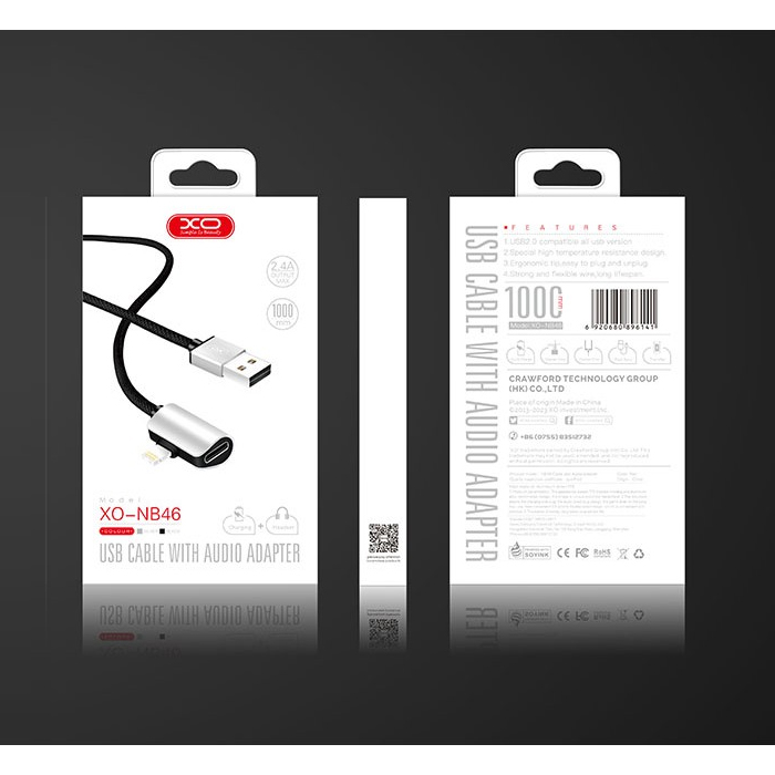 XO 2 in 1 lightning usb cable with lightning-female adapter plugin port available for music. The usb cable can charge your device to max 2.4A and supports data transfer. Model: NB46 – Input: Lightning Length: 100cm