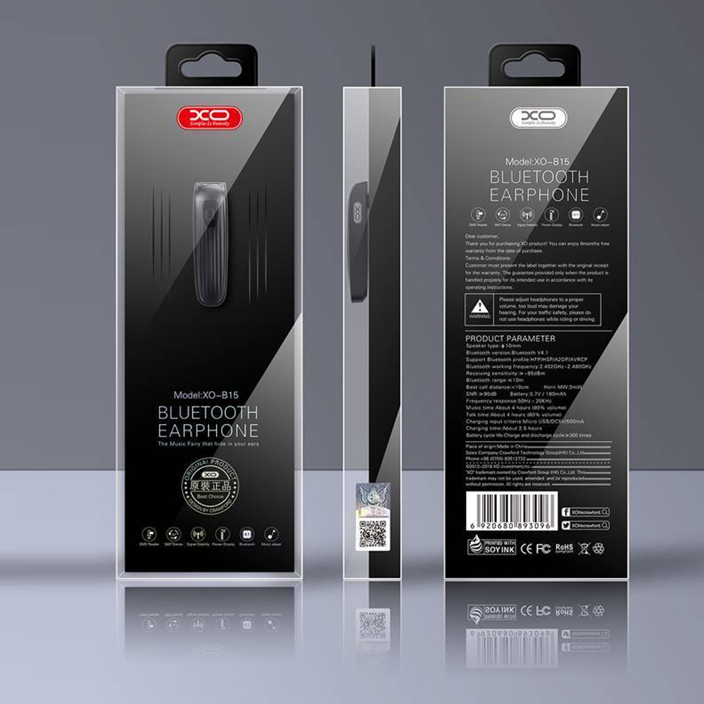 XO Business Bluetooth Headset – B15 – Bluetooth Version: V4.1 – Battery: 70mAh – Calling time: 4hrs – Compatible: All Bluetooth Devices