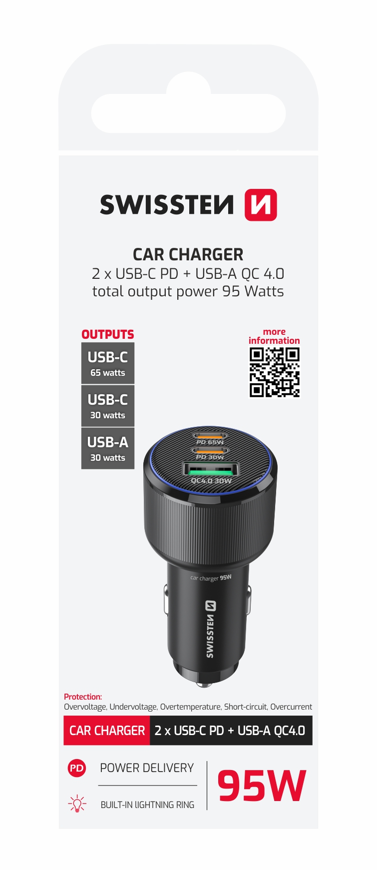 Swissten Triple USB-C And USB-A Car Charger (95W) – 20111906 – Black